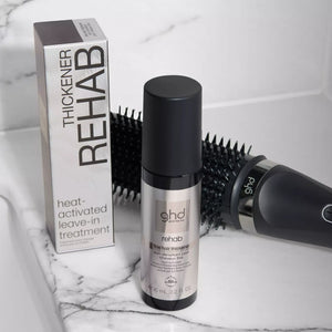ghd Rehab Fine Hair Thickener è uno spray volumizzante per capelli fini senza risciacquo attivato dal calore, con una formula avanzata e leggera che aumenta il diametro di ogni singolo capello¹, donando immediatamente capelli più spessi e visibilmente più pieni². Attivato dal calore e pensato per dare il meglio con la spazzola asciugacapelli 2in1 ghd Duet Blowdry, ma compatibile anche con ghd Helios e le piastre per capelli professionali ghd. Questo trattamento è un perfetto rimedio per capelli fini: ispessisce ogni fibra capillare, mantenendo la naturale condizione dei capelli e lasciandoli visibilmente più sani, voluminosi ed elastici¹.